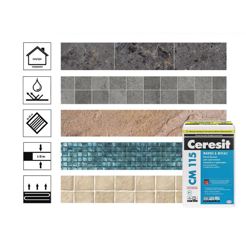 Ceresit CM 115 - представляет собой клеевую смесь применяемую для монтажа всех видов мрамора, стеклянной мозайки и камня. Основанием могут служить различные недеформируемые поверхности, такие как бетонные плиты, стяжки, а также поверхности обработанные цементными растворами или штукатурками.