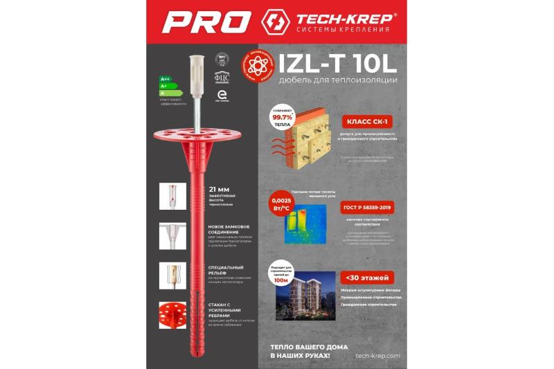 Дюбель для теплоизоляции с металлическим гвоздем и термоголовкой Tech-Krep IZL-T применяется для крепления теплоизоляционных материалов к бетону, полнотелому и пустотелому кирпичу, камню, пенобетону. Дюбель для теплоизоляции с металлическим гвоздем и термоголовкой Tech-Krep IZL-T применяется для крепления теплоизоляционных материалов к бетону, полнотелому и пустотелому кирпичу, камню, пенобетону. Дюбель для кирпича Tech-Krep IZL-T используется для монтажа на стенах, особо подверженных неблагоприятным воздействиям атмосферных условий. Состоит из дюбеля с двухсегментной распорной частью, имеющего увеличенную прижимную шайбу диаметром 60 мм и гвоздя металлического с нейлоновой термоголовкой высокой ударной прочности.
